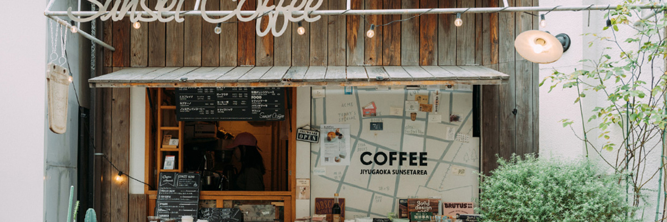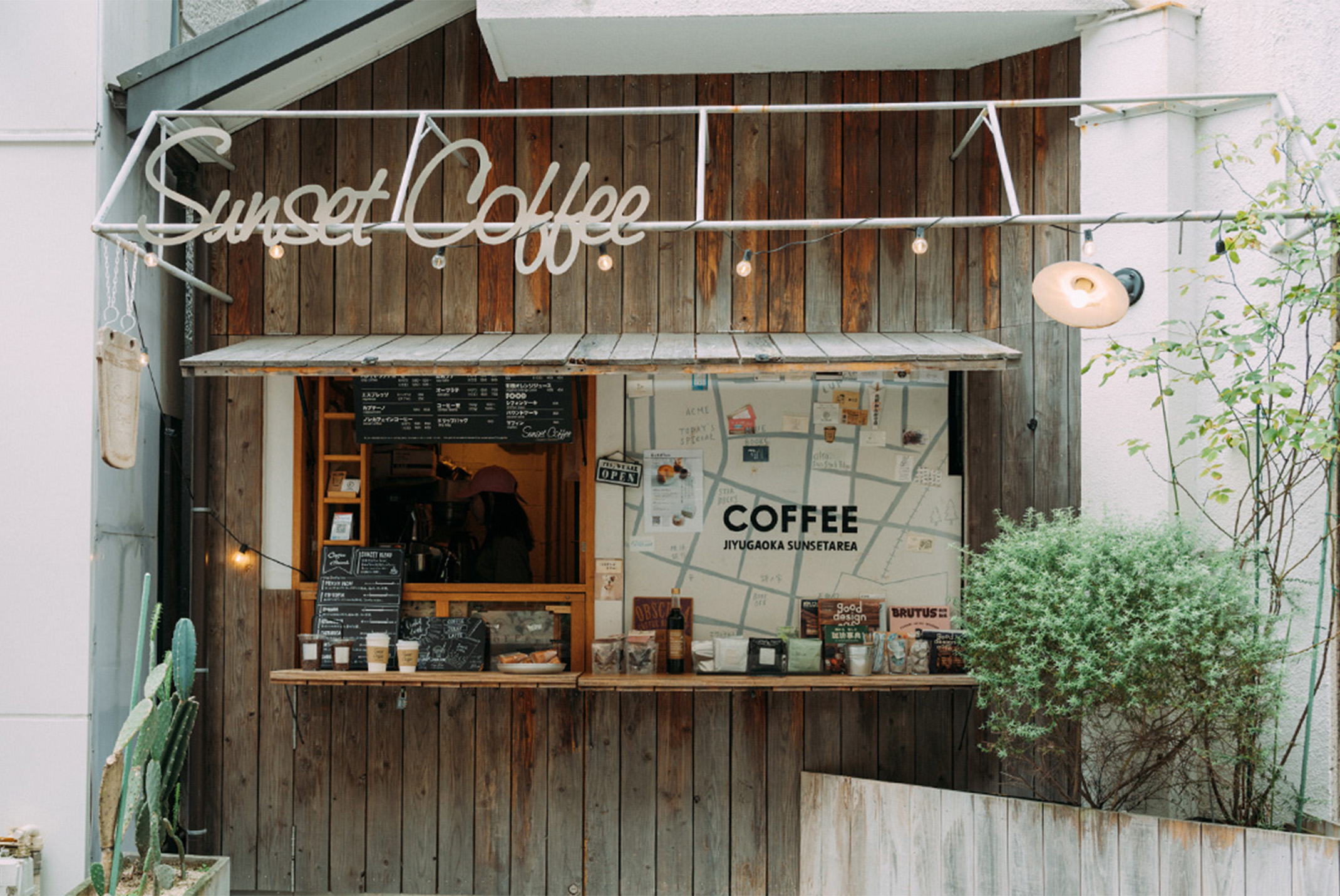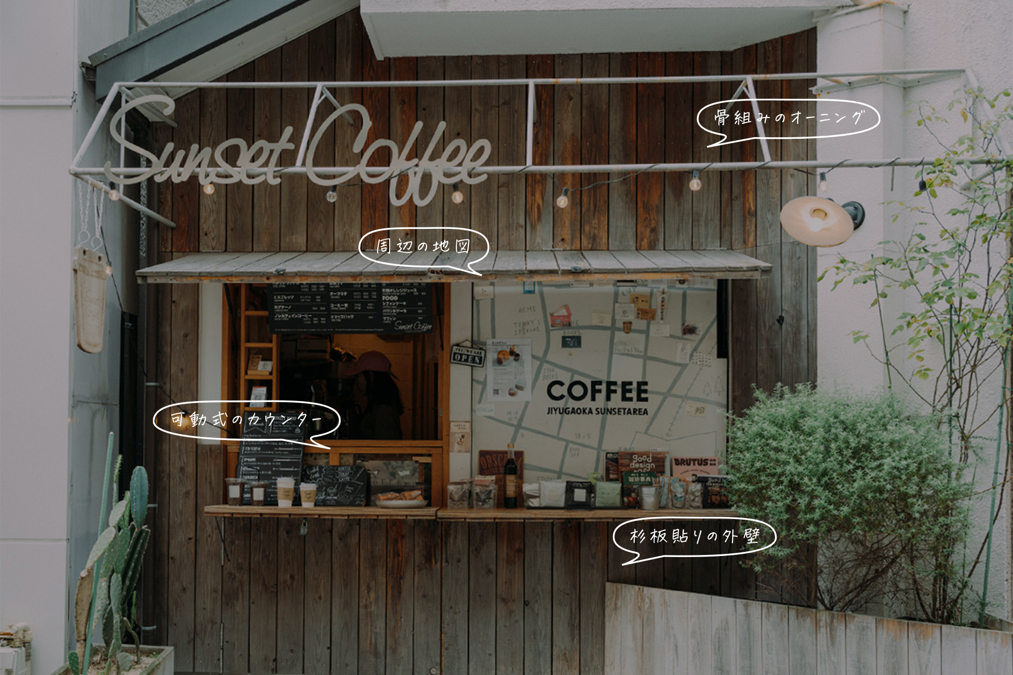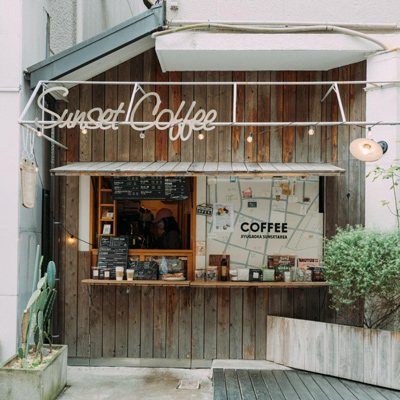 自由が丘にある「Sunset Coffee」は、ビルの物置をリノベーションした約一坪の小さなコーヒースタンド。その外観には古い杉板を使用しており、自然素材の温かみを感じさせます。特徴的なカウンターは可動式で、建具を持ち上げると庇としても機能するというユニークなアイデアを採用。コンパクトながらも、デザインの工夫で居心地の良い空間を提供し、今では街の案内所のような存在になっているんだとか。