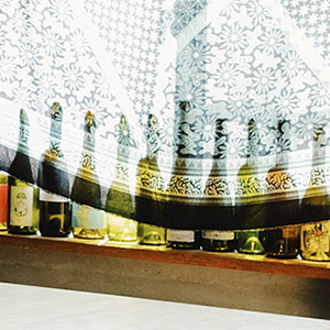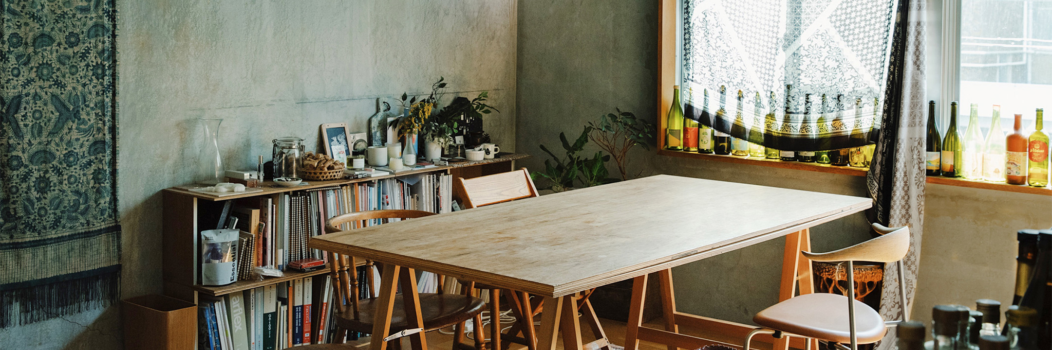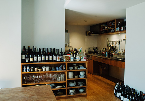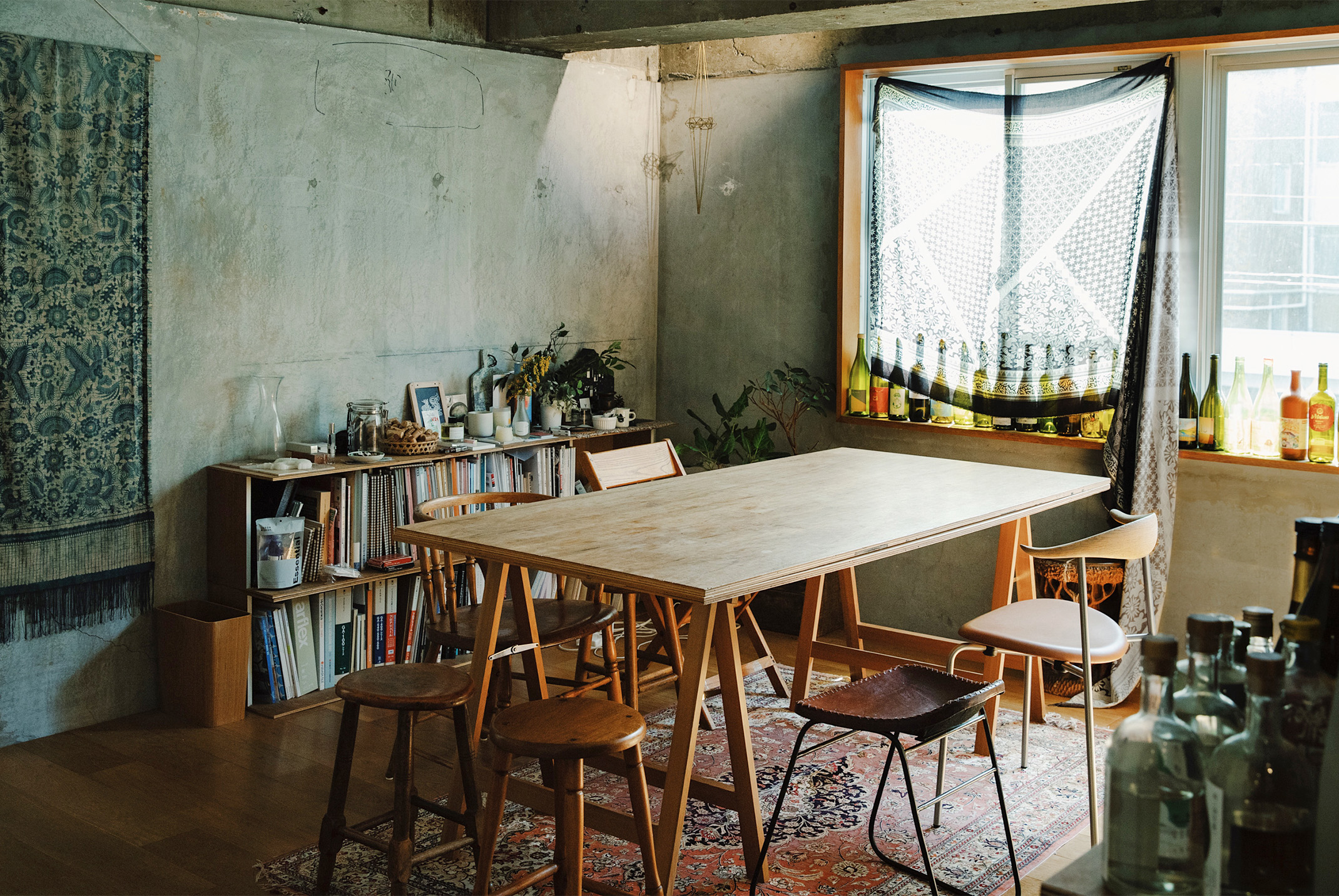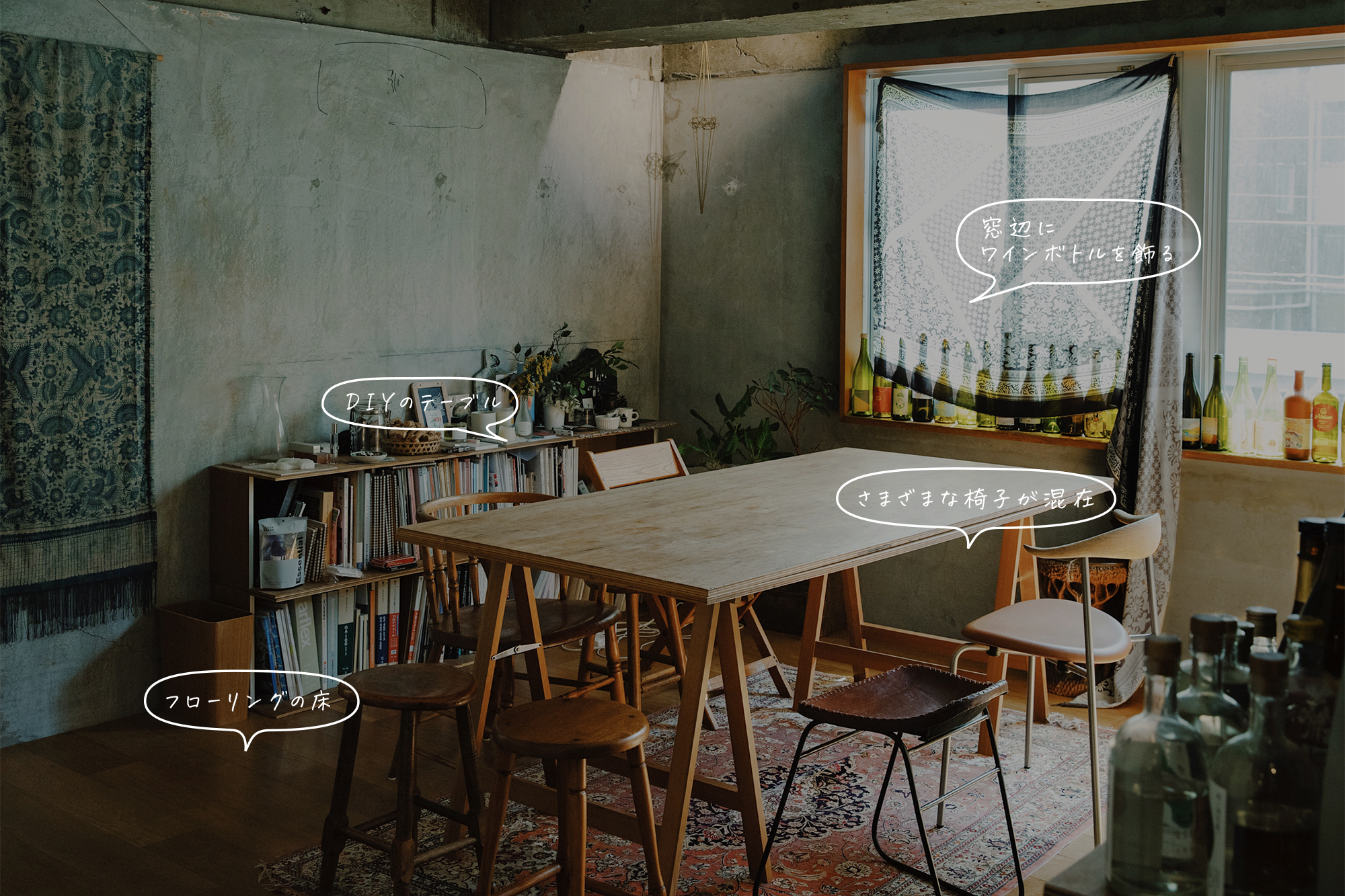 人が集まるダイニングには、窓辺にワインボトルを飾って賑やかな印象に。