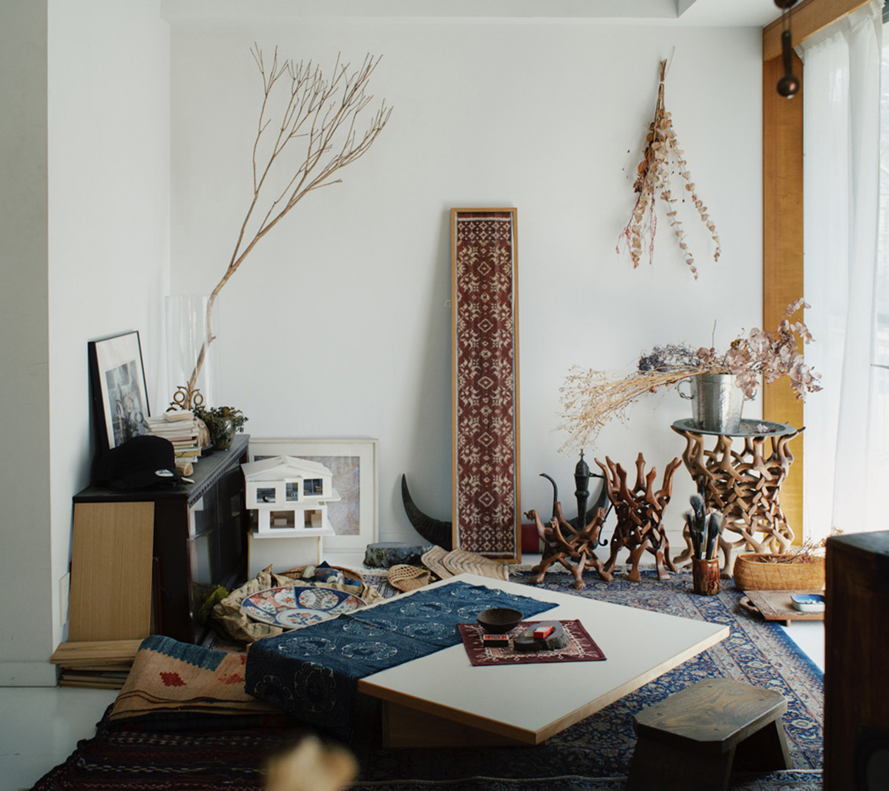 床はフローリングで温かみを演出。エキゾチックなラグも雰囲気にマッチしています。