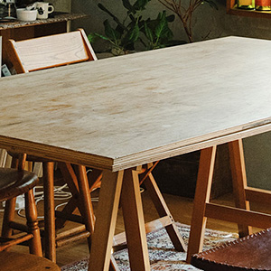 ダイニングテーブルには、既製品の脚にベニヤ板をのせてDIYしたものを使っています。