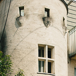 車庫の上にあたる部屋は円柱状に。小さな窓と相まって、まるでお城のような雰囲気。