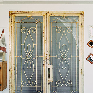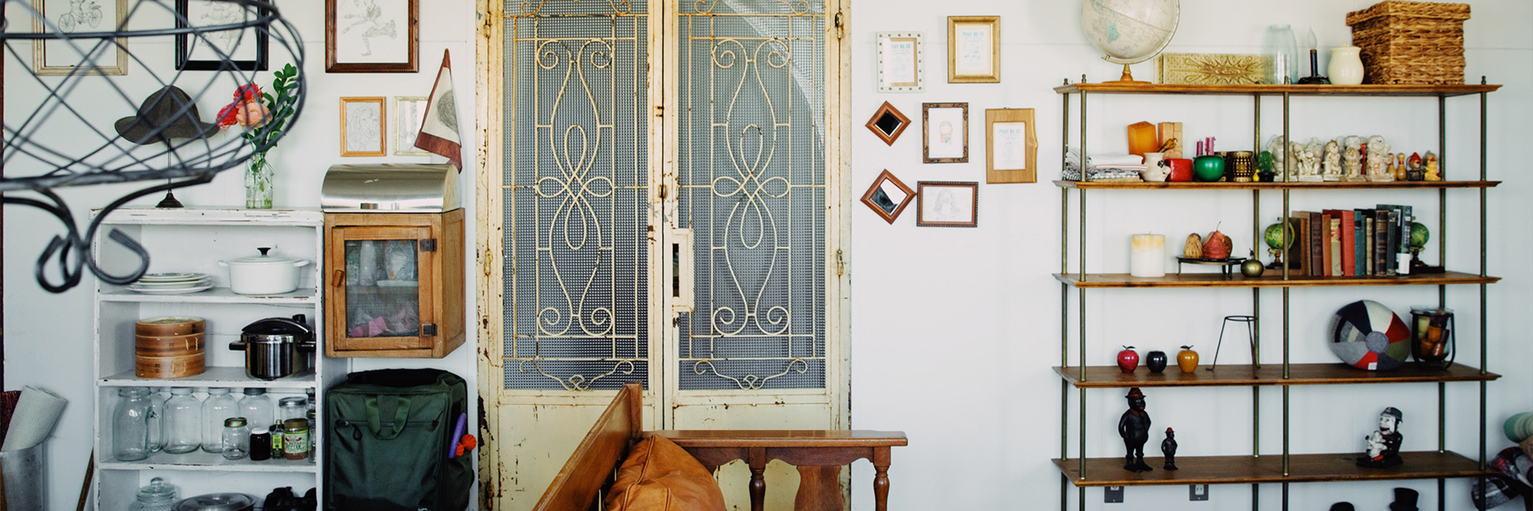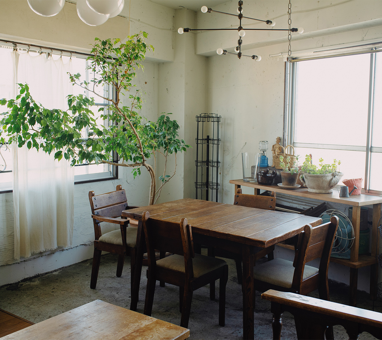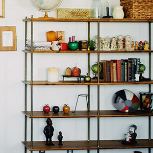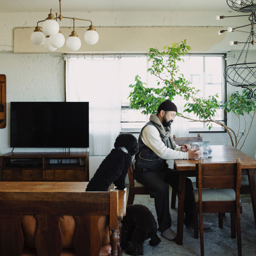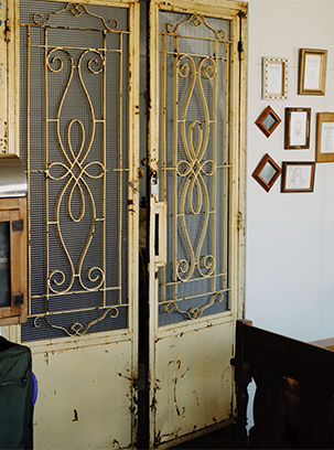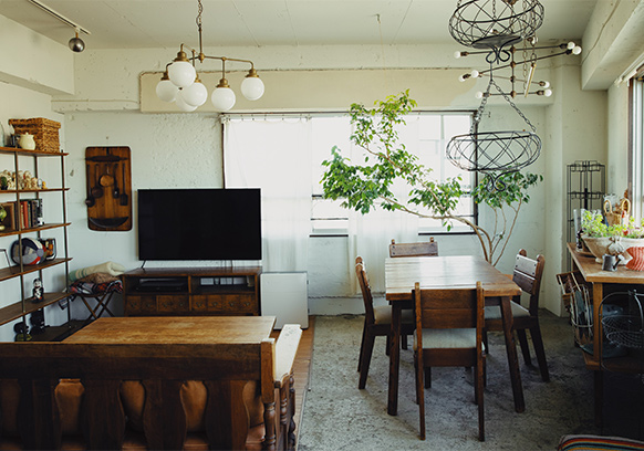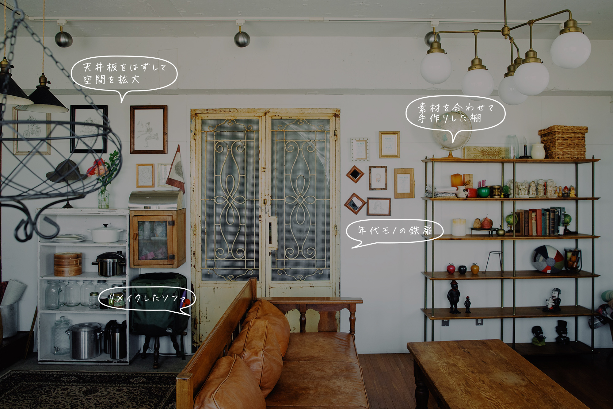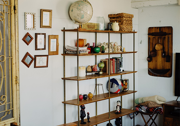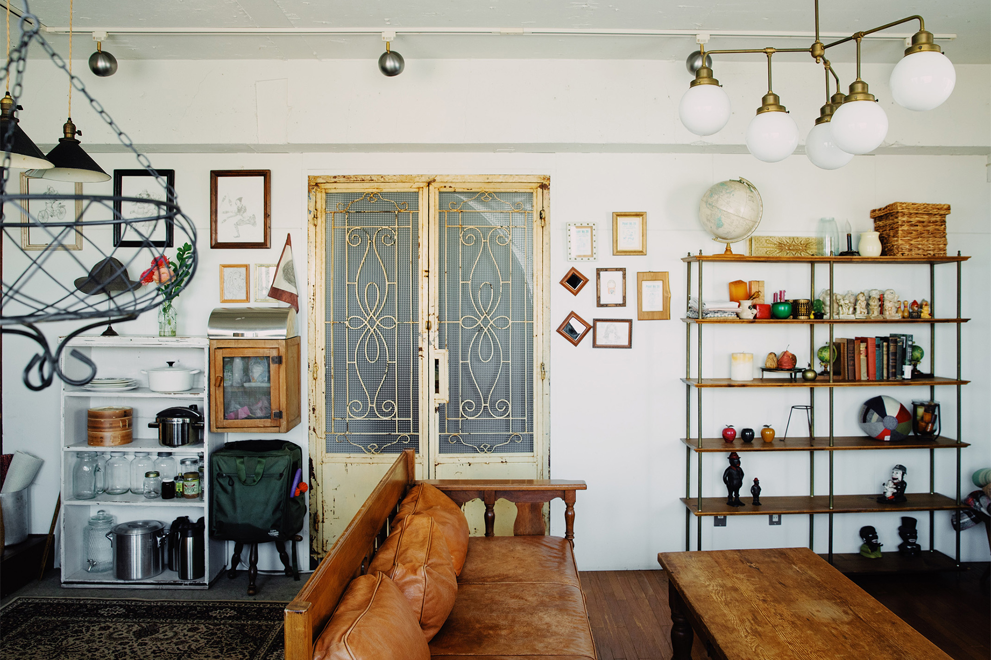 築50年のマンションの改装では、ヴィンテージ感のある要素はそのまま残したという杉村さん。リビングにある印象的な鉄扉は、もともとあった窓のフェンスの装飾とマッチさせています。雑多なオブジェが並ぶ棚は、ほかの家具と素材を合わせて手作りしたもの。国や年代がさまざまな家具や雑貨を組み合わせるコツは、材質を揃えたり、国の位置が近いものから順に並べたりするなど「つながりをもたせること」だそうです。