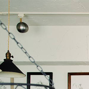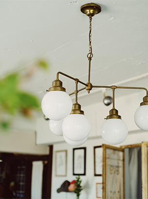 家具の素材に合わせて、照明のパーツと同じ真鍮のパイプやオーク材で棚をDIY。