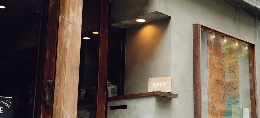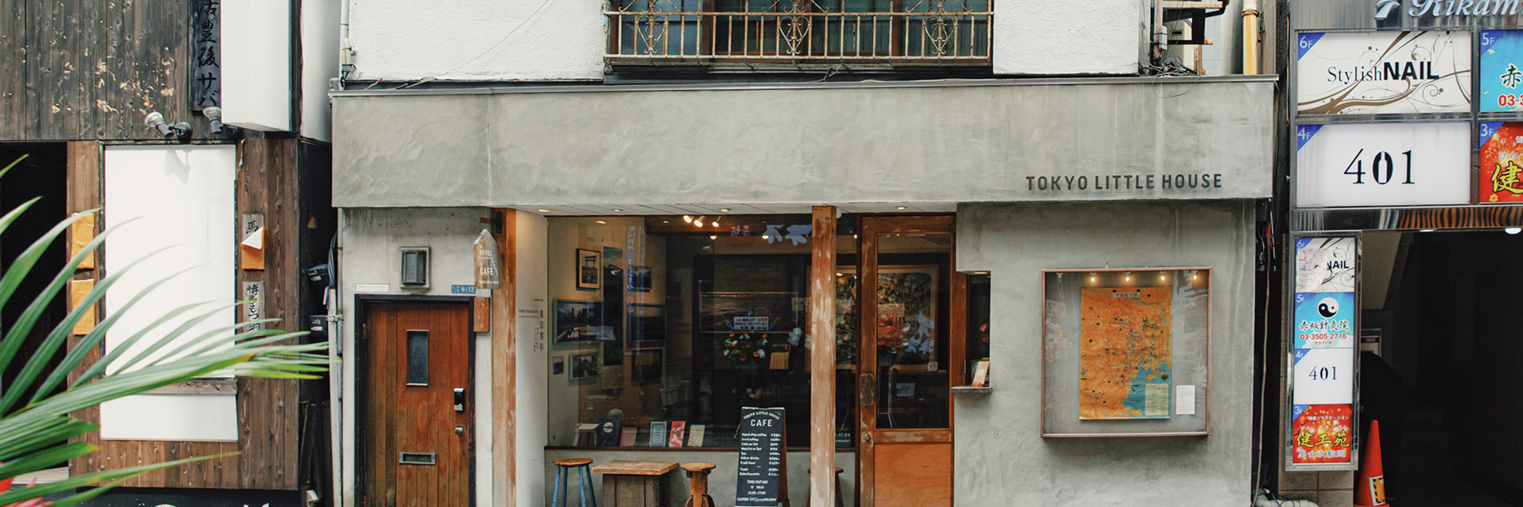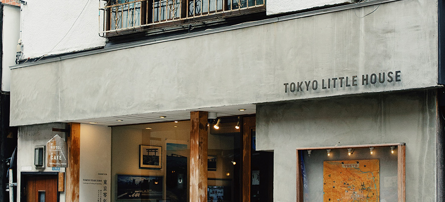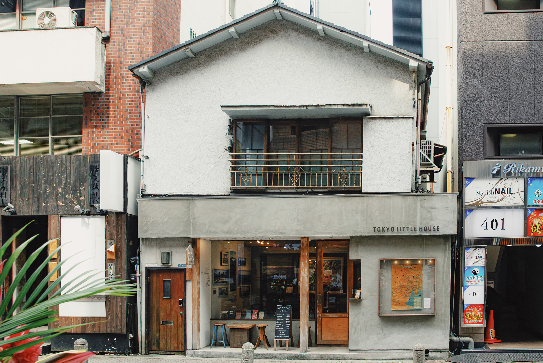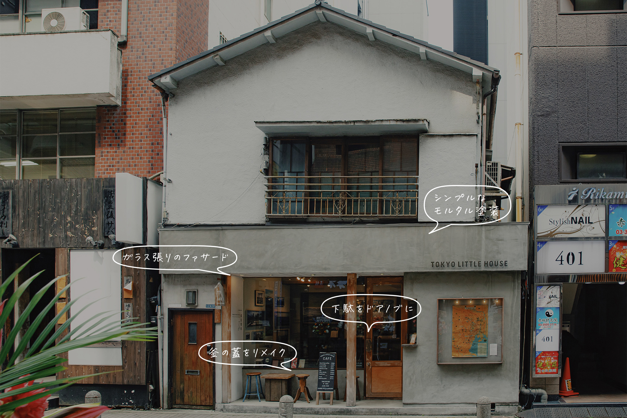 赤坂のカフェ&ホテル「TOKYO LITTLE HOUSE」は、築70年の古民家をセルフリノベーションしたもの。賑やかな店が多い繫華街の中に「少し違和感」を生むことを目指し、外壁はDIYでシンプルで綺麗なモルタル塗装に。ドア前にそびえる柱は、後ろをガラス張りにして抜け感のあるバランスに調整しました。ドアノブに使ったのは、なんと下駄。元・古民家建物にフィットする、遊び心やが光ります。