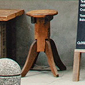 ユニークな形が目を引く椅子は、釜の蓋に脚を取り付けたもの。