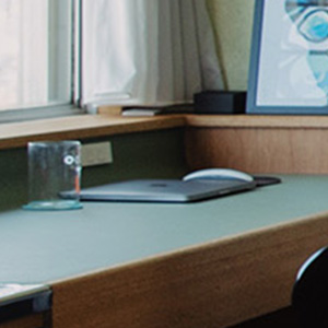 デスクや円形テーブルの表面は、塗装職人さんとコラボしたオリジナルのリノリウム。