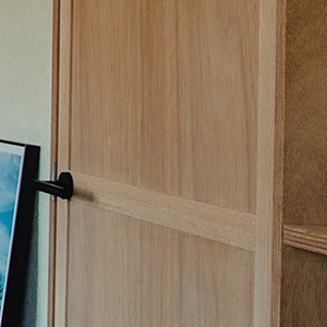 ドアや棚など建具は、昔の赤っぽい色のラワン材を使用。