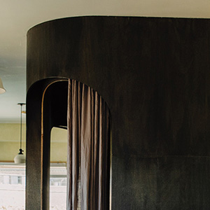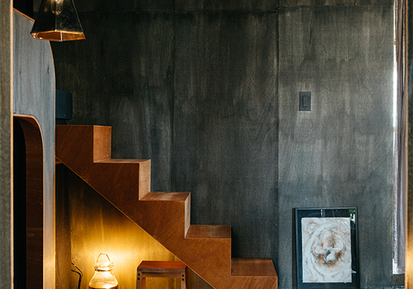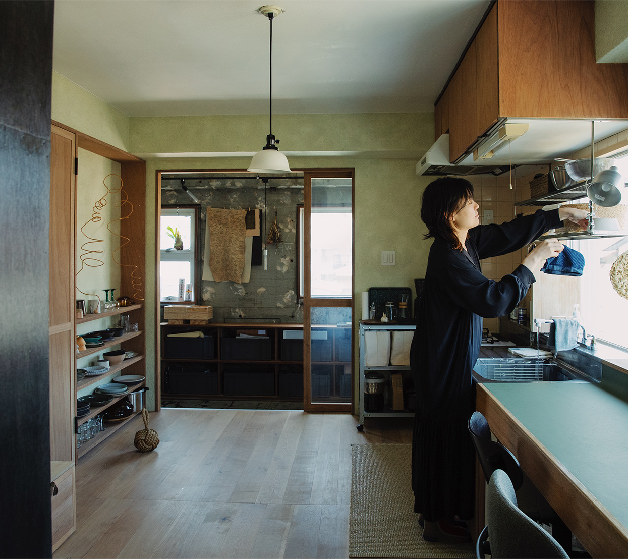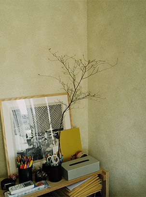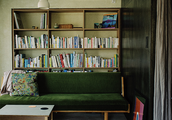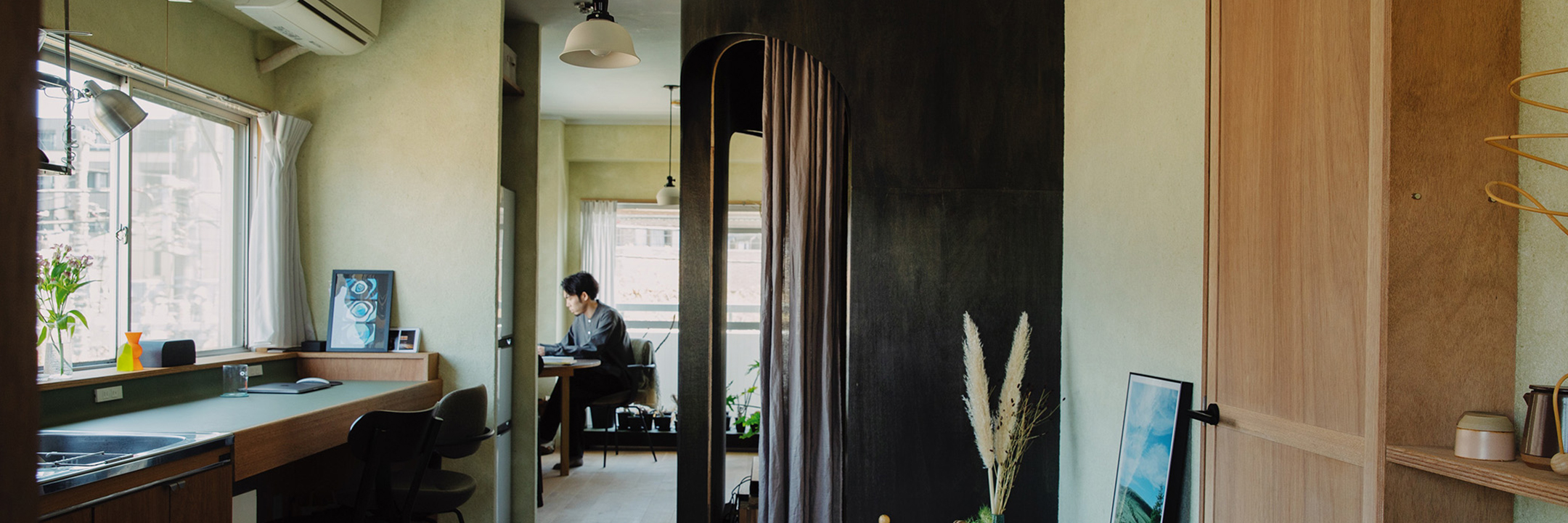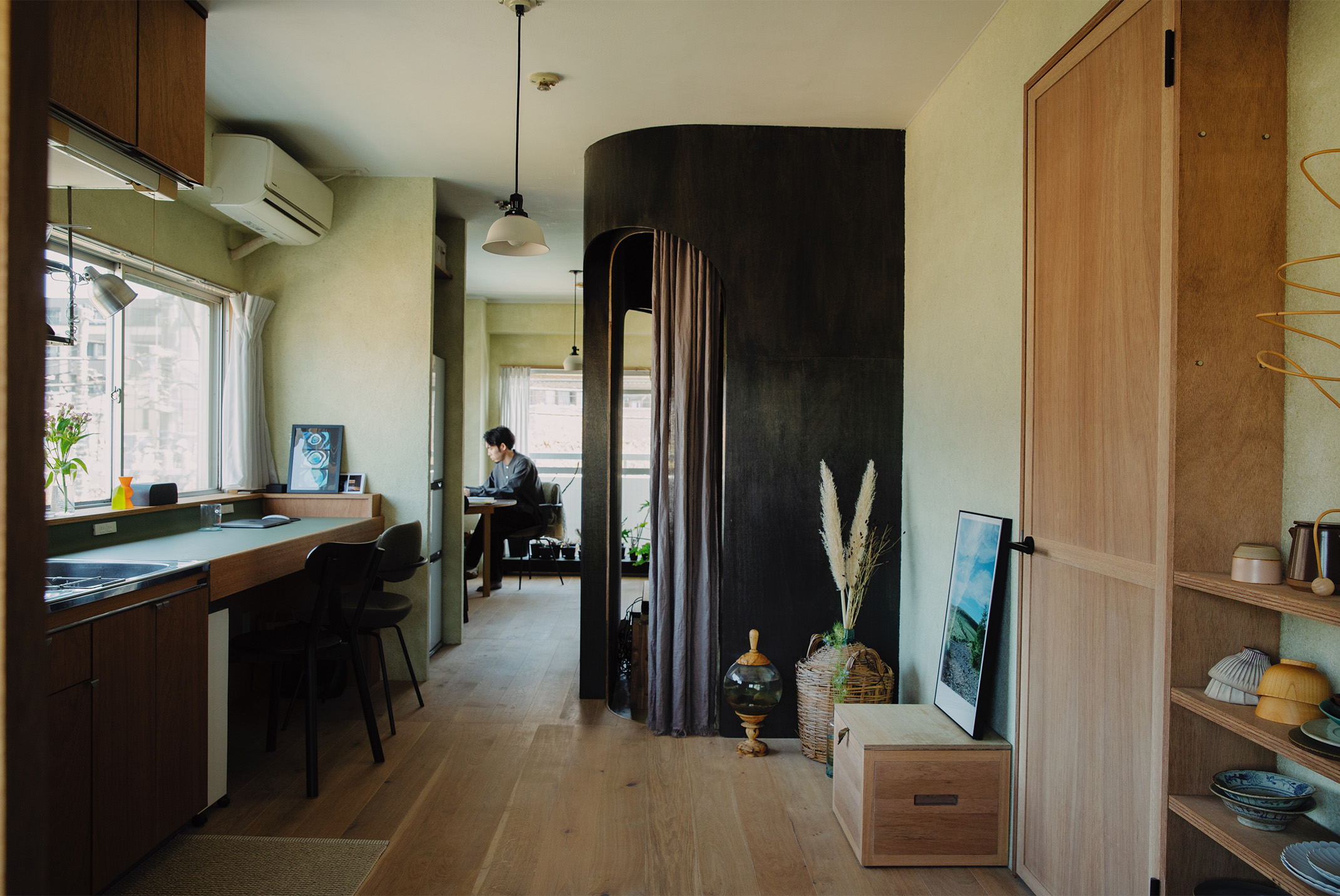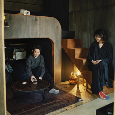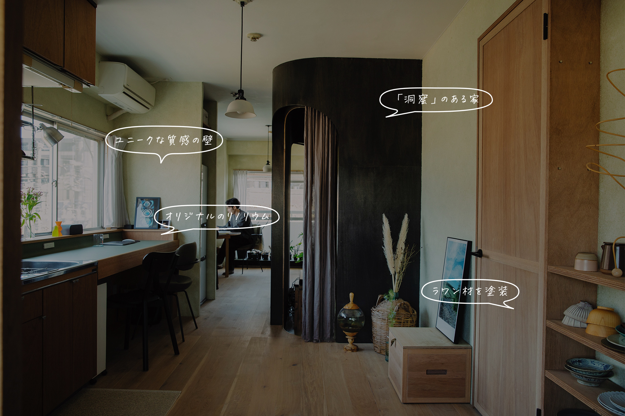 賃貸を全面リノベーションした、建築家梅村さん&神永さん夫婦の住まい。リビングの中心には「洞窟」をコンセプトとした独自の空間があります。仕事をしたり、本や音楽を楽しんだりと用途はさまざまで、日の光が入りづらい部屋でも居心地よく過ごすためのアイデアなのだとか。その他にも、壁や家具、建具の質感にもユニークなこだわりが。中でもラワン材の建具は、独自のレシピで作った塗料で仕上げています。