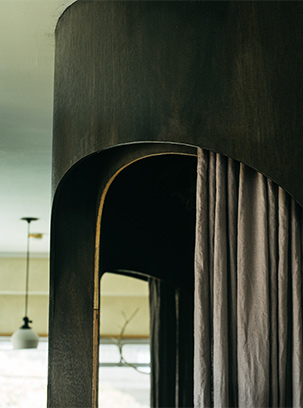 壁全体を黒く塗った洞窟は、外側を光沢ある塗料で仕上げて軽やかな印象に。