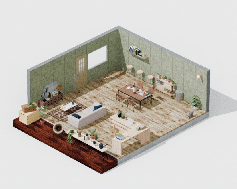 ライトグレーとミントグリーンをベースにしたカラフルなリビング