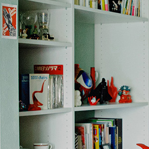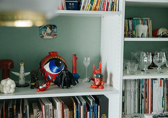 棚には20世紀デザインや現代作家の作品など、アバンギャルドなオブジェが並びます。