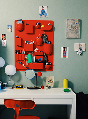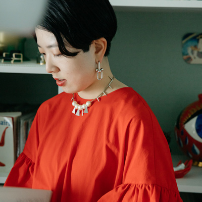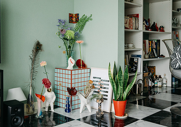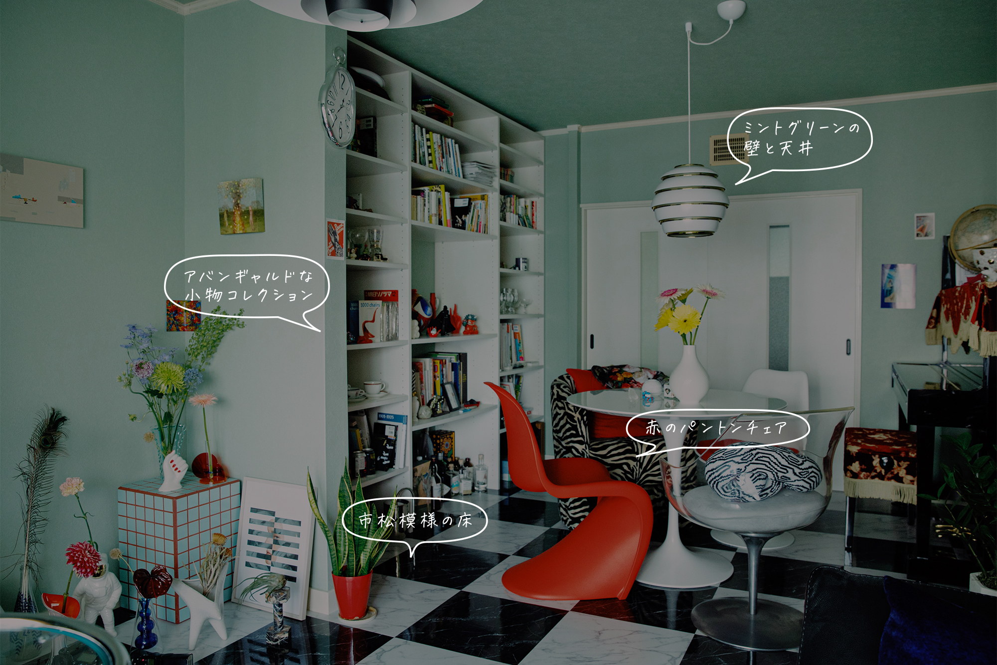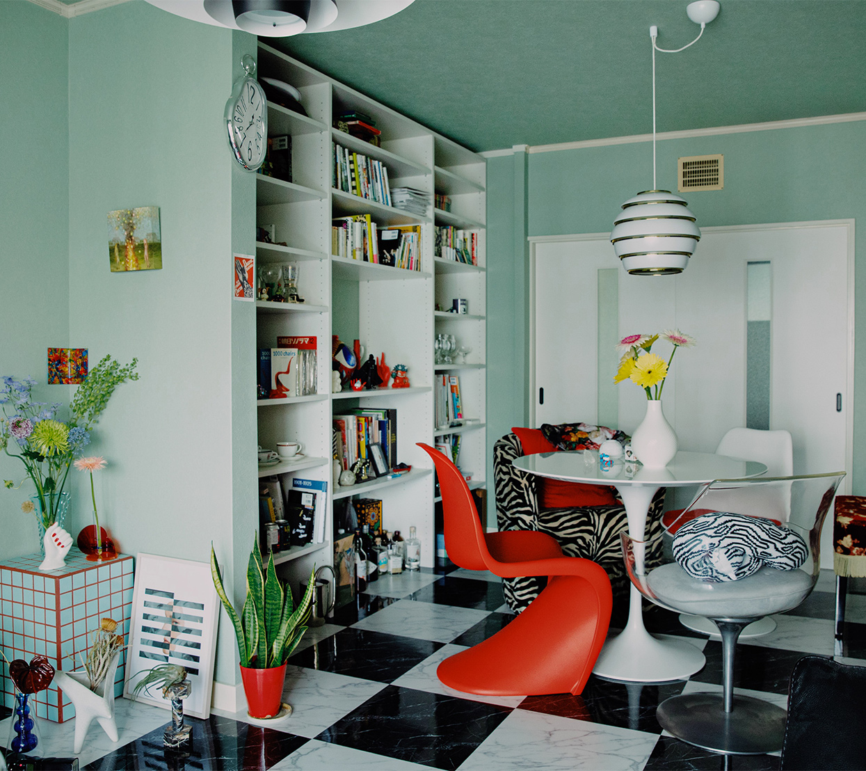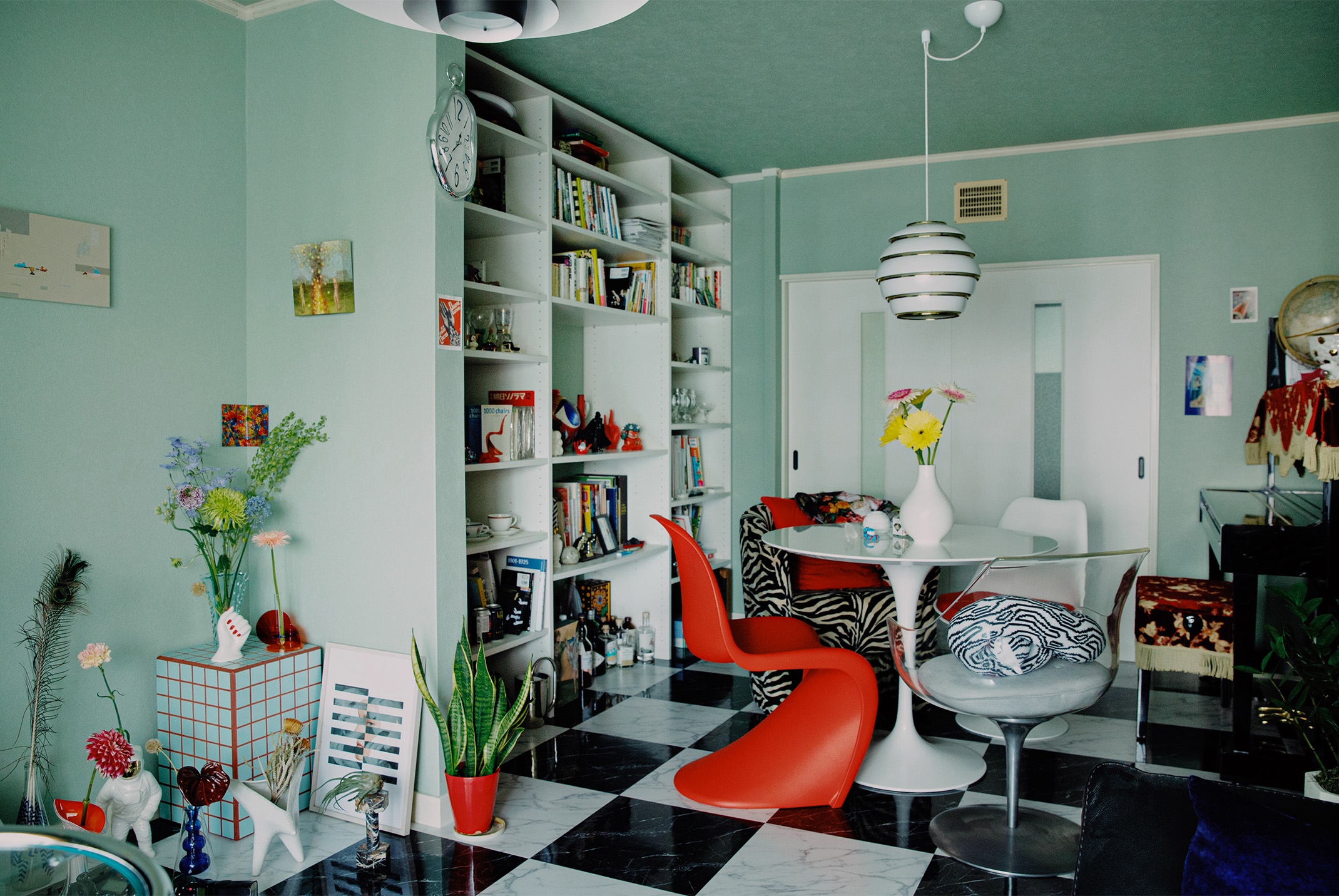 ミッドセンチュリーの家具が主役のリビングは、ポップな色彩と現代アートの奇抜なオブジェが目を引きます。それぞれが個性的で主張の強い家具や小物類をまとめるコツは「基本色と差し色を決めて統一感を出す」こと。ここでは白、黒、シルバーを基本に、差し色として赤を使うことで、空間全体でひとつの世界観をつくり上げています。床の素材や壁の色も家具を引き立てることを考えて選んだのだとか。