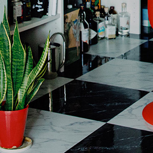 黒と白の市松模様にした光沢のあるタイル張りの床は、家具との相性もピッタリ。