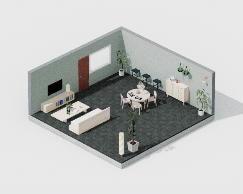 ライトグレーとミントグリーンをベースにしたカラフルなリビング